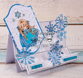 I have gone with the reds & blues using copcis & gel pens on her. She sitting on a side stepper card in white. The backing paper is anchors with waves,boat,blue gems & blue glittery sentiment to finish.