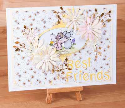 This is a cute image called PALS, I have gone with spring colours. There are coloured with copics,gel pens & crystal glitter. Cut in oval & added to the yellow glitter frame. This is on the daisy backing paper & layer on the cream. My other extras are the die cut flowers,sentiment pearls & gold leaves.
