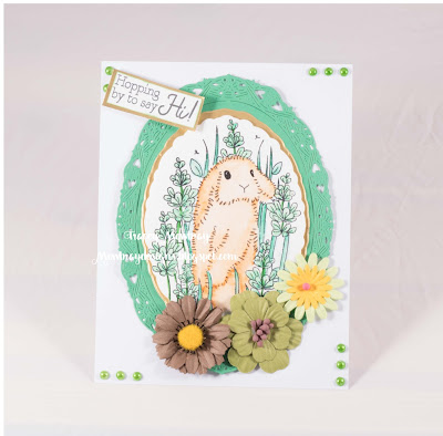 I have used one of the Dreamees stamp set for this card. Coloured with my watercolour pens. Cut out in oval & matted on to gold & green layers. To finish added the stamped sentiment,flowers & green gems.